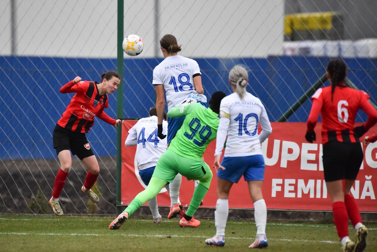 Kiegyensúlyozott játékot hozott az első félidő, amikor bár a hazai csapat több szögletet harcolt ki, a vendégek mégis kettővel vezettek, a kevés gólhelyzetükből kétszer is betaláltak. Előbb Bălăceanu volt eredményes csak Tankó kapussal szemben a 19. percben (0–1), majd a 23. percben Ioana Stancu lövése csúszott be a csíki kapus kezei között (0–2).